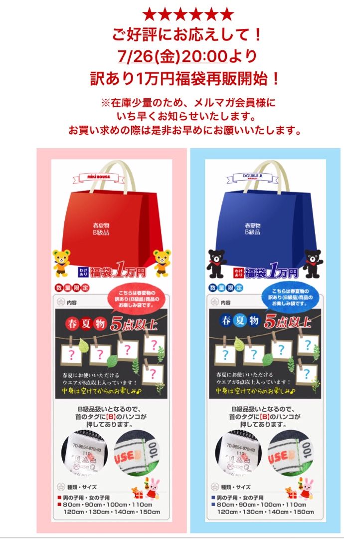 B品福袋の再販のメルマガ届きました! 今度こそ買う! 絶対買う! が残念なことに在庫を見ると、ほしいダブルBは120は再販ないじゃない なんですと!? ダブルビー ☆1万円☆ 訳あり B級品 お楽しみ福袋【男の子用】【女の子用】80cm〜150cm ダブルB ダブル・ビー ダブルビー ☆1万円☆ 訳あり B級品 お楽しみ福袋【男の子用】【女の子用】80cm〜150cm ダブルB ダブル・ビー ミキハウス☆1万円☆ 訳あり B級品 お楽しみ福袋【男の子用】【女の子用】80cm〜150cm ミキハウス☆1万円☆ 訳あり B級品 お楽しみ福袋【男の子用】【女の子用】80cm〜150cm