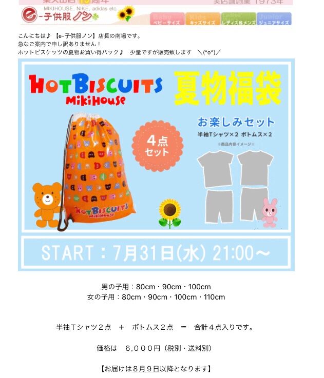 キャンディベアさんでホットビスケッツのサマーパックが販売されてます ただ画像が出ない 発送は29日以降 これは販売されてるってことでいいのかな? ホットビスケッツ【HOT BISCUITS】サマーパック 福袋(男の子・女の子)(90cm-110cm)
