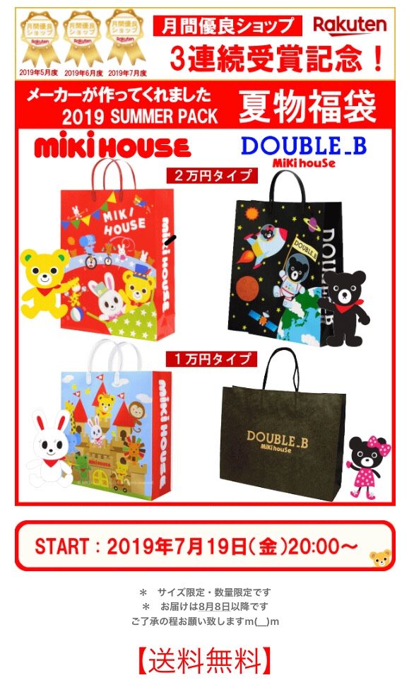なんとびっくり 子供服ノンさんでミキハウスとダブルBのサマーパックが本日20時から販売です しかも、2万と1万!! 2019年って書いてあります B品福袋ばかり気をとられてたけど、えらいこっちゃ! もうどうしたらいいのやら どっち優先? B品いってからのノンさんかな でも1万?2万? サイズはどうしよう ここにきてすごく悩む 【8/8以降のお届け】ダブルB福袋【夏物2万円】【2019年】MIKIHOUSE【送料無料】【ベビー】【キッズ】 【8/8以降のお届け】ミキハウス福袋【夏物2万円】【2019年】MIKIHOUSE【送料無料】【ベビー】【キッズ】 【8/8以降のお届け】ミキハウス福袋【夏物1万円】MIKIHOUSE【送料無料】【ベビー】【キッズ】 【8/8以降のお届け】ダブルB(ミキハウス)福袋【夏物1万円】【送料無料】Double_B by MIKIHOUSE