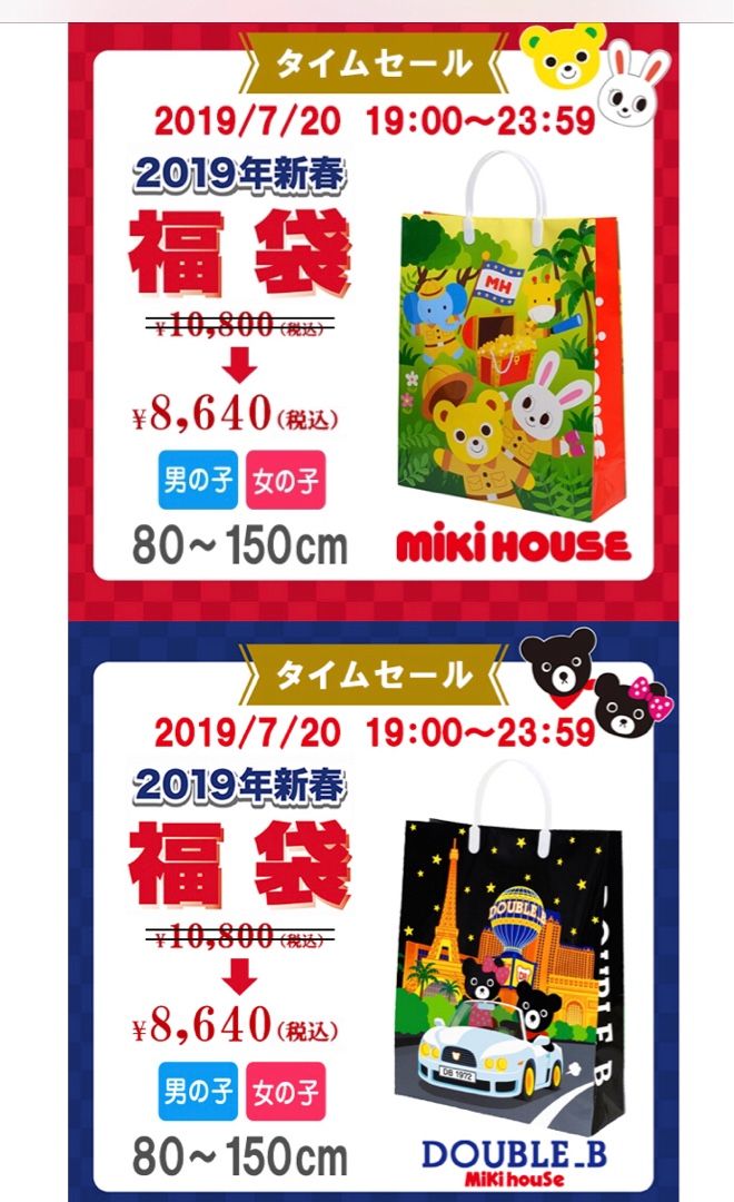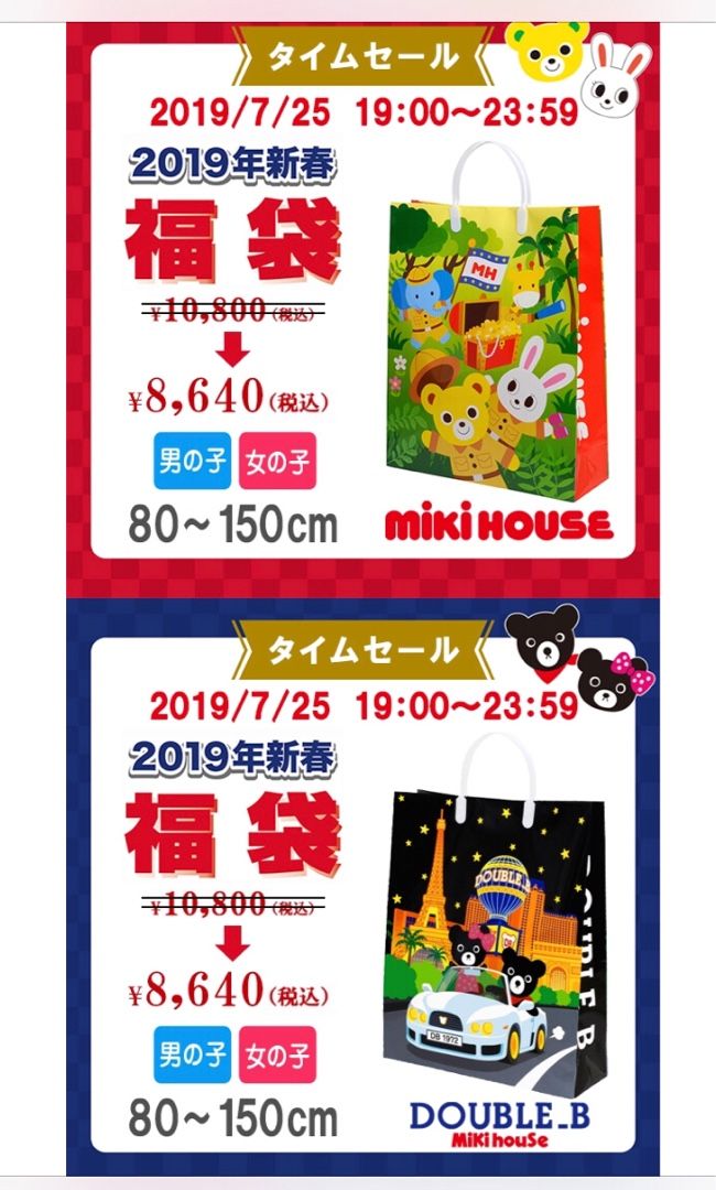 順調に最後まで行くも最終のポチしたあとに、売り切れが出て買えず 慌ててミキハウスにするも完売 ノンさんの1万があると行くもこちらも途中で完売 あげく手を出してはいけないと決めた2万に手を出してしまったー (涙) 気持ちに一度火がつくと止められない まだ買えるかな? 【8/8以降のお届け】ダブルB福袋【夏物2万円】【2019年】MIKIHOUSE【送料無料】【ベビー】【キッズ】 20%オフもあります 20日19時から4時間限定 ミキハウス正規販売店/ミキハウス ダブルビー mikihouse 1万円(税別) 新春福袋 男の子・女の子(80cm・90cm・100cm・110cm・120cm・130cm・140cm・150cm)【2019 福袋】 ミキハウス正規販売店/ミキハウス mikihouse 1万円(税別) 新春福袋 男の子・女の子(80cm・90cm・100cm・110cm・120cm・130cm・140cm・150cm)【2019 福袋】