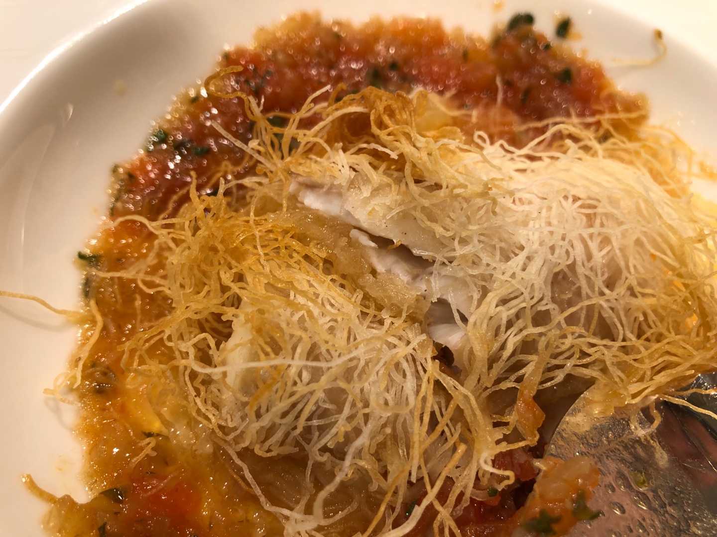 カダイフ、魚を包んだもののこと。トルコの極細の麺だそうです。サクサクとして、なかの魚の暖かさ、ジューシィさが保たれていて、食感の違いもいい。