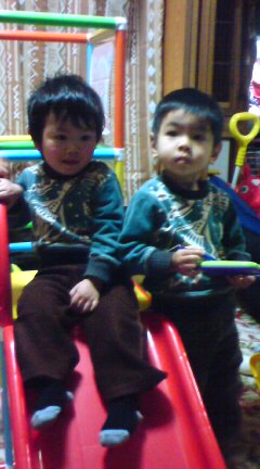 心配していた昨日の大雪の予報ですが、こちらはそれほど積もることもなく、溶けるのも早かったです朝起きて、の状態を確認した私は、良かったぁ~ランチに行ける~と、ルンルンで朝の支度をしていたのですが、友達からが来て、子供さんが朝方から吐き続けているので断念しますとのこともう一人約束していた友達と決行しても良かったのですが、その友達からもが来て、実は風邪ぎみだったので、1人キャンセルになったことだし今回は・・・とのことその友達は来月に結婚式をひかえているので無理は禁物ですからね残念ながらランチは中止になったことを休みで寝ているパパに伝えてから、はるさんを保育所に送り、りくさんを連れて健康相談に行きました相変わらず健康相談では、りくさんは身体測定を拒み、その部屋に居ることすら嫌がって出て行こうとばかりしましたそれを何とか引き止めようと、保健婦さんが検査用の小さな積み木や、数種類の絵が描かれてあるボードを出して見せてくれました。体重計に乗るのを嫌がって脱出しようと頑張っていたりくさんは、それを見て少し興味を示してくれたので、保健婦さんがそれを使って検査をしてくれましたボードには車、バス、魚、靴、犬、ジュースの絵が描かれていて、保健婦さんが聞いた物を指差して答えるというもので、全問正解して褒められたりくさんは少し得意げでしたが、それが終わると「もうええやろ?」みたいな感じでさっさと部屋を出て行ってしまいました結局、昨日もこんな感じで身体測定はできず、ただ遊びに行って来たようなものです来月には正式な2歳児健診がありますが、今から嫌な予感がしていますその帰りに、用事でパパの実家に寄って甥っ子と少し遊んできました義父が休みで居たので、りくさんは風船をもらって嬉しそうでした相変わらず、りくさんは甥っ子とオモチャを取り合ってケンカばかりしていましたが、昨日は偶然同じ服(同じのを買ったのも偶然)を着ていたので、一緒に遊ぶ姿を見ると何かの同盟のようでおかしかったです双子でお揃いってこんな感じなんでしょうねお昼になったので帰ると、ちょうどパパが起きたところで、パジャマでウロウロ外に出て来ていましたそのままの格好でお昼を食べて、の電球を交換するとかで、部屋に戻ってきたのは15時過ぎでした。大きなを出すのが面倒なので、パパにはるさんのお迎えに行ってもらおうと思っていたのですが、人前に出られる格好ではないからと、結局私もりくさんも乗っていってのお迎えになりましたそしてまたパパの実家に用事で寄って、1時間ほど遊んで来ましたそこで義妹達と回転寿司の話が出たので、帰り道に「寿司食いたいなぁ!」とパパ。「近くにないやん!!どこまで行く気?」と私。「食べたい!お寿司~♪」とはるさん。「見て!ポケモン!」と(一人関係のない会話をする)りくさん。家に着いたものの、結局「寿司食いに行くか?」ってことになり、40分ほど走った後に高速に乗りわざわざ行ってきましたよパパも日曜日に一人で出かけたのが悪いと思って連れて行ってくれたんでしょうねそこの回転寿司は初めてだったのですが、注文したお寿司が新幹線の形の台に乗って、専用レーンですばやく席まで届くしくみになっていて、子供達は大喜びでしたでも、味はイマイチだったかな・・・。今日も寒い1日でしたが、はるさんの保育所では防火凧揚げがあったようです去年同様、手作りの凧を揚げたようですが、自分の好きな絵を描いてるようで、はるさんはポケモンをいくつか描いたらしいです先生からの連絡帳を読むと、「テンション上がりまくりで凧が落ちても引きずって走ってた」そうですさて、どんな凧を持ち帰ってくるやら?
