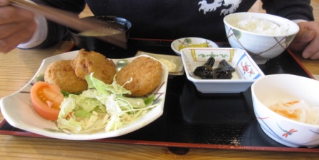 1月4日山口県の「道の駅豊北」へ 行ってきました 買い物と昼食が目当てです 夫は「いかコロッケ定食」 近くの特牛漁港はイカが名産なんです 何と読むかわかりますか? 特牛「こっとい」と読みます 私は天ぷら定食 写真ではご飯の量が際立っていますが えびの天ぷらがとても大きくて 尾までバリバリとおいしくいただきましたよ~ 写真はありませんが 次男はふぐの天ぷらがのった ふく天そば こちらではふぐではなくふくと呼びます 本当は刺身が目当てでしたが 大人気のためすでに完売でした 海を眺めていたら まるで照明のように鳥がとまっていました 昨日はPM2.5の影響で空がかすんでいたため 良く見えないのですが 右上の方には「角島大橋」がかすかに見えます パンや梅干し、かまぼこ 今ブームののどぐろのせんべいや炊き込みご飯の素を 買って帰りました さっそく炊いたのどぐろ飯 ほんの少しだけ入っていました
