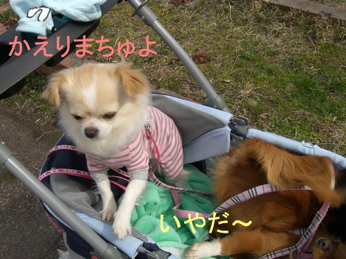 今日から、またお仕事です風邪もすっかりよくなったし・・・楽しいお休みでした次のお休みまで頑張って働かなければ・・・ では、一昨日から続いてる、散歩の日記です最近、ハルトとふ~ちゃん連れて外に出てなかったから嬉しくて一杯写真撮ったので許してくださいね昨日のコメントに頂いてたように、ふ~ちゃんはせっかく広い公園にいっても、ずっとダッコなのです寒くなってきたし、そろそろ帰ることにしました ハルトは駄々をこねて、バギーの中で暴れています暴れすぎてお洋服脱げてしまいましたバギーから降ろしてハルトは歩いて帰る方がいいみたいです。 引っ張ることもなく、遅くもなく、なかなか上手に歩いてますふ~ちゃんは、バギーから見える景色を楽しんでるみたいです写真は地面見てますけど・・・ すぐに、お家に到着~お家の前でお写真とりましょう 2人とも全然カメラ見てくれないので、困っちゃいますもう、お家に入りました 対象的なお2人・・・ひなびた公園ですが、空いてるのは良いことですもんねコメント見させて頂いて、そう思いました。小さい子供さんとかいたらハルトが吠えないかヒヤヒヤしますから・・・。また、近いうちに遊びに行こうっと3日間、公園ネタに付き合って下さってありがとうございますみなさんのブログ見てたら、ワンコ連れで旅行に行かれたり羨ましいです家は、ドッグランもカフェにも行ったことないんですよ~奈良にはそういう所まだまだ少なくって・・・しばらくは公園で遊ぶのが1番のおでかけになりそうですチワワブログランキング参加中です応援して下さってる方、本当に有難うございますとっても、感謝しています クリックして下さいね