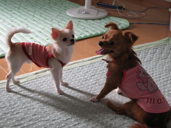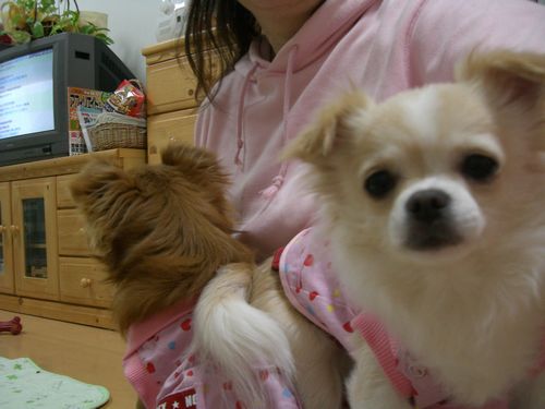 おはようございます昨日、夕方ひとりで少し遠くのスーパー銭湯に行ったのですが・・・仕事帰りもあって、眠たくて・・・一人用の壷湯に入りながら、ウトウト~口あけて寝てました時計みたら、なんと35分も寝てた!!他のお客さん、だれも、死んでるとか心配にならなかったのか!?もしかして・・・イビキかいてたのかも・・・さて、すっかり暖かくなってきましたが、夜はまだ少し冷えますね石油ファンヒーターの前で暖を取ってると・・・ハルトとふ~ちゃんが、お膝の上に乗ってこられます この、ピンクのお揃いのお洋服去年の夏は大きすぎてブカブカだったのに・・・今日久しぶりに着せたら2人とも小さくて1番上のスナップが止まんなかった成長したんだな~ハルト、今いったい何キロあるんだろう・・・図るのが怖いわチワワブログランキング参加中ですみなさんのお陰でUPしてきてます!!!ありがとうございます是非是非クリックしてくださいね