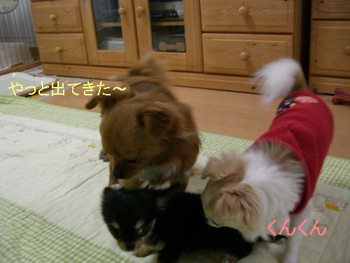 こんにちはさて、昨日の問題みなさんすぐにお分かり頂けたようですね!!さすが~、チワワ大好きさんです往復約4時間かけて、雨風の中、奈良の田舎町から大阪まで行ってきましたよ帰りは、仔犬連れなので、空いてる電車を選んで京都経由で帰ってきたのでした前置きはこの位にして・・・この度、縁あって家の子になってくれた・・・チワワちゃんですじゃじゃじゃ~ん!!!!家に辿りついて、すぐの写真ですブラックタンの男の子です12月25日クリスマスの日に産まれましたお耳が大きくて立ってます!!・・・今の所は・・・家で飼うと垂れ耳になるかも???2階のリビングに連れて行き、ハルトとふ~ちゃんとご対面仔犬ちゃんはブルブル))ハルトは少し吠えたけど、その後は仔犬が気になって仕方ないのか!?ず~っと、サークルの前で仔犬を見てますハルトのこういう所、すご~く大好きふ~ちゃんは、ちょっと微妙~何度もワンワン吠えてましたしばらくして・・・ご飯あげましたブリーダーさん家では、もうカリカリフード食べてたとの事なので・・・8粒だけ、食べましたもっと、食べてくれないかな~ちょっと、心配・・・ハルトもふ~ちゃんも初めからガツガツ食べてた仔だったので・・・今日の夕方まで、お母さん、お父さんと一緒にいた仔だから淋しいだろうな~そうですよ大切に育てるからねハルトとふ~ちゃんも気になる様子早く、仲良くなってほしいな~微妙なふ~ちゃん・・・お名前は、まだ考え中ですはやく、いいお名前付けてあげないと!!今後とも、ハルトふく+仔犬ちゃんのブログ宜しくお願いします昨日は、たくさんの人に訪問、応援ポチして頂き・・・すご~く感謝しています。ランキングも17位までいきました。ランキング上がるのは、もちろん嬉しいのですが・・・それより、このブログを楽しみにしてくださってる方がいることがとっても嬉しかったです仔犬ちゃんお迎え祝いに・・・ポチっと応援してくだされば嬉しいです