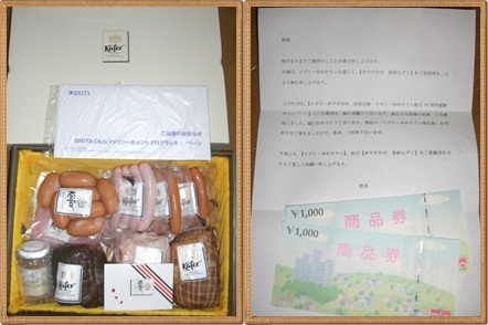 本日1回目。コメ返まだですが、先に更新お許しを~ 今日は午前中パパから頼まれた用事を済ませ、午後は実家へ息子を預け、私は歯医者へ 少し前から気になってはいたけど、昨日焼肉食べてから、歯が痛くなっちゃって痛みが強いので麻酔しての治療で、今日は削っただけで終わり、また明後日受診することになってますが…今もとっても痛いです鎮痛剤飲んだけど、あんまり効いてないのかな さて、そういうわけで実家へ帰っていたときにお届け物が届きましたまずは、画像ないですが、母の名前でマックスバリュ九州×ロッテよりベルメゾン3000円分クーポンそのまま母にしてきました 他2件は自宅に届きました↓左からブリタJAPANより、ケーファー ハムなどのアソートセット~こちらはブリタのポイントクラブに旦那の名前で登録してるので旦那名義で届きましたw 右はゆめタウン×恩納もずく でゆめタウン商品券2000円分こちらはお友達にはがきをいただいて、急いでゆめタウン行ってもずくをまとめ買いして応募しました(笑)いつもラッキーはがきありがとう 先月好調だったので、今月はあまりお届け物なさそ~って思ってたのでまとめて届いて嬉しかったです この調子でまたお届け物がありますように