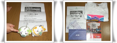 本日1回目昨日は午後から歯科受診のため実家へ行って、夕方パパから「晩御飯いらな~い」ってあったのでそのまま晩御飯を実家で食べて、おふろまで入れてもらって22時過ぎに帰宅w上げ膳据え膳、息子の世話免除=実家サイコー それはさておきw昨日、自宅と実家にお届け物がありました~左がまず朝から自宅に届いた、キンチョールのキャンペーンでJCB3000円コースに1口応募していたけど本賞逃しのW賞で蚊取りぶたのぬいぐるみストラップ2個組さっそく息子のおもちゃですw 右はそのあと自宅に届いた、ヘインズのTシャツ。こちらは110周年のキャンペーンに応募してその場で当選がわかるゲームもあったのでチャレンジしたら当選パパが寝るときに着るそうですw↑まだキャンペーン中です現金110万円が10名さまに~ 右の画像のもう1つは、実家に届いたキンチョーからのJCB5000円自宅のW賞と同じキャンペーンまたまた母の名前でご当選 「最近おかーさんよく当たるよね~」って話してたら、そういえば、今年、母はある意味当たり年だということに気づきました…。実は、今年始めに下肢静脈瘤のオペを受けたり、少し前に飼い犬に足を噛まれてしまって、大変なことになったんです><犬の散歩してたら、よその犬が放してあってケンカになったので、実家の犬は大型犬で、相手が中型だったので怪我を負わせてはいけないと母が仲裁に入ったら、自分が噛まれてしまったという…ケンカ中だから本気で噛んでるし、大型犬なので口も大きいから大怪我でした><そういうわけで、今年は当たり年かって話になり、父に「宝くじを買え!」って言われて母苦笑してた… このキャンペーンは、ちょうど5月くらいに我が家の外にある木に毛虫が大量発生してキンチョールが大量に必要だったんで3口応募できたんですw 6月30日〆のに私・母・旦那の名前で応募してたのですが旦那のは外れちゃったようです><でも実家とW当選できたので、すごい嬉しい 今月も残すところ1週間程…、またお届け物がありますように