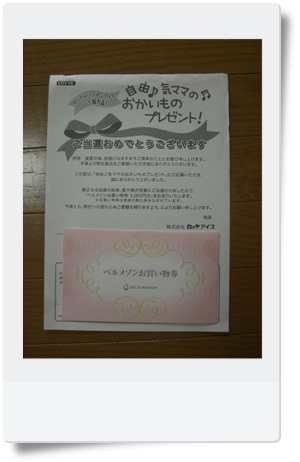 本日1回目の日記昨日、幼児教室へ行く前にメール便でお届けものが月曜に実家へ届いたものと同じのが自宅分でも当選マックスバリュ九州×ロッテで50名枠でした3000円分のベルメゾンお買い物券だけど、何を買おうかと悩み中~何もなければ、母へして合わせて6000円分お買い物してもらってもいいかな~ またお届け物がありますように