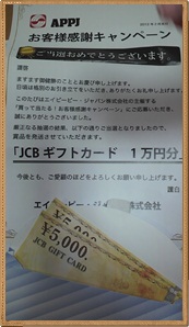 本日1回目の日記。昨日はお届け物が1つありましたAPPJより JCB1万円~普通のクロネコメール便で届いたので最初はなんかのDMかと思った 12月末〆でコピー用紙を買ったレシートで応募でした。コピー用紙まだいっぱいあったけど、そのうち使うし腐るもんじゃないからと買ったんだよねw実になってよかったです またお届け物がありますように