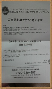まずはお届けものの記録から~ひっさびさにお届けものがありました~チキータバナナで現金3000円バナナをあまり食べてくれない旦那と息子なので何かキャンペーンがないとほとんどバナナって買わない我が家ですw1人で黙々と食べ続けなければいけないので私にとってはややハードルが高く、実ってくれてうれしいですバナナ、嫌いじゃないんだけどね… またお届けものがありますように 最近パパから何かと雑用を頼まれて、毎日忙しくて私もお疲れ気味ですが今日は時間間違えずにちゃんとお迎えに行きましたよ~バスから降りるとすぐに「今日はね~、ハハの日のヤツ持って帰ってきたんだ~」「でもまだ内緒だから、ちょっと待ってて」とか言いながら慌てておうちに入って、息子の部屋にかばんを持って行って…何やら取りだしたかと思ったら後ろ手に隠して、「ママ!いつもありがとう!!」と大きな声で言いながら↓差し出してくれました。開けてみると↓似顔絵とお手伝い券付のサンクスカードでした私、髪はストレートですが…と突っ込みたくなる部分はあれどちゃんと目と鼻と口を描いててくれて(笑)お手伝い券はまだ字が書けないからきっと先生が手を添えて書かせてくれたんだろうな~。でも、とってもとっても嬉しくてウルウルしちゃいました… 先生が渡し方とセリフを教えてくれてたみたいで「おかあさん泣くかもね~」って言われてたらしい笑涙目になっただけなので「ママ泣かんかったね」と突っ込まれました でも、ちゃんと先生から教えてもらった通りに渡せたし、ちょっとお兄ちゃんっぽくなったなぁ~と成長に感動しました。 今日は生まれて初めて、ちゃんと母の日のプレゼントをもらった記念日になりましたありがとう