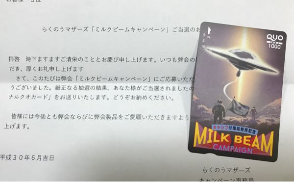 先ほど当選連絡が♪ ケイエス食品の肉団子のキャンペーンより EJOICA セレクトギフト 7000円分 の当選メールが届きました〜♪ 7月1日より使えるとのことで WAONにするかアマギフにするか… Edyでもnanacoでもいいし… しばらく悩みます(笑) あとは、 少し前に自宅と実家にお届け物。 らくのうマザーズより クオカード1000円分 キャップ付きの牛乳買って応募してました。 自宅と実家、それぞれ1口ずつ応募して どちらも当選できて嬉しい♪ またお届け物がありますように🍀 にほんブログ村