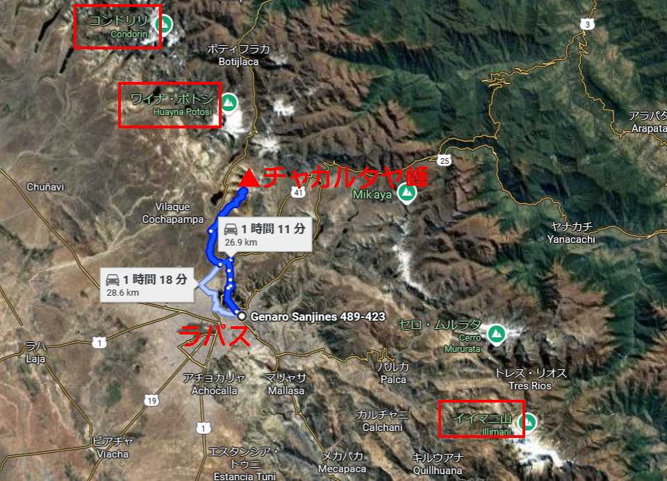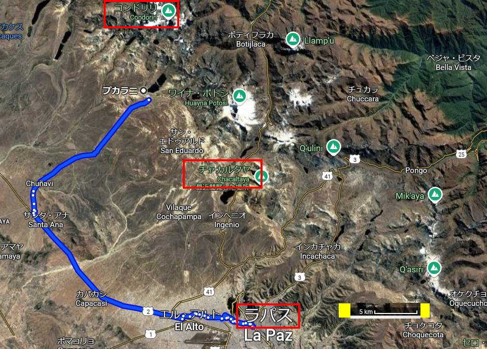 昨日に続いて2003年8月に訪れたボリビア・アンデスのアルバムです。ラパスのホテルに連泊し、最後の目的地であるチャカルタヤ峰(5395m)に向かいました。下のマップが示すように、チャカルタヤ峰はラパス近郊にあります。当時はギネスブック認定の「世界最高所のスキー場」になっていましたがウィキペディアによれば、現在は閉鎖されたようです。【ラパスからチャカルタヤ峰までのマップ。チャカルタヤ峰から展望できる山々】【途中、ラパス市街地を見下ろす。イリマニ(6438m)も見えている」【ワイナポトシ(6088m)の頂上が頭を出す】(チャカルタヤ峰方面の山々)(左クリックで拡大できます)(ワイナポトシ)(イリマニと頂上近くの池)【頂上ロッジ。ここまで車で登れる】