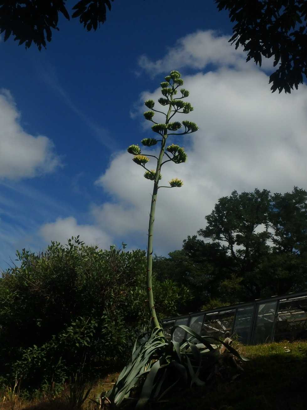 7月31日の岡山は最高気温が38.0℃まで上がりました。昨日の37.8℃を超えて、今季いちばんの暑さとなりました。このところずっと午前中にウォーキングに出かけていますが、9時すぎに出かける時点ですでに31.1℃、家に戻る11時頃には34.7℃となっていて、熱中症予防にはなっていません。それでも、半田山植物園の開園時刻9時に合わせたほうが、いろいろな植物が観察できてやる気が出てきます。その半田山植物園ですが、屋外のアオノリュウゼツランに続いて、温室内のリュウゼツラン『マルギナータ』も花を開き始めました。こちらのほうは花茎が低く、接写が可能となっています。このほか、シダレエンジュの花が見頃となってきました。【リュウゼツラン『マルギナータ』の花】【オニバス(←パラグアイオオオニバスとは別)の花をかろうじて確認】【ネコノチチ】【シダレエンジュ】【八重ヒマワリ。サンキング】【スプリンクラーの虹】【自宅で育てているレインリリーとコチョウラン】