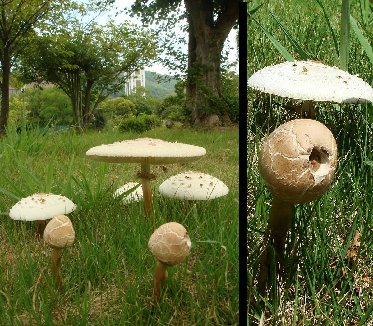 8月下旬に大量の雨が降ったおかげで、大学構内各所で、待ってましたとばかりにたくさんのキノコが出現しました。写真は時計台前のカラカサタケです。過去の出現例から見て、毒キノコのオオシロカラカサタケの可能性が大です。そんななか、目玉おやじそっくりのキノコを見つけました。目玉の中心はおそらく、虫に食われた穴ではないかと思います。強い日照りのせいか、傘を開かないうちに固くなってしまったようです。