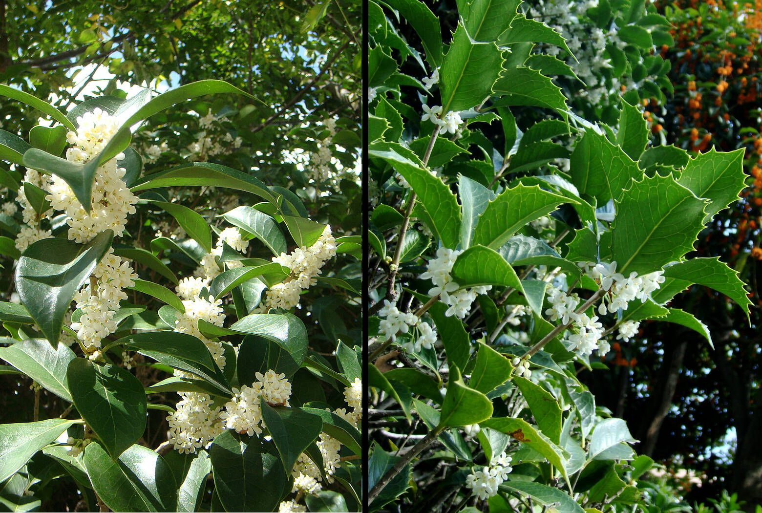 じぶんの日記(10/19付)に、金木犀と銀木犀が並んでいる写真を掲載しました。大学構内には金木犀はいたる所に植えられていますが、銀木犀のほうは病害虫に弱いせいか、殆ど見あたりません。白花があっても、近づいてみると殆どが柊木犀(ヒイラギモクセイ)です。写真左は、葉っぱのふちがなめらか(全縁)になっている正真正銘の銀木犀、右側は、すべての葉っぱがギザギザ(鋸歯)になっている柊木犀です。もっとも、じぶんの日記の写真にもありますように、たいがいの木は同じ枝に、全縁とゆるやかな鋸歯の両方の葉っぱをつけています。遺伝的にはもともとこういう木なのかもしれません。
