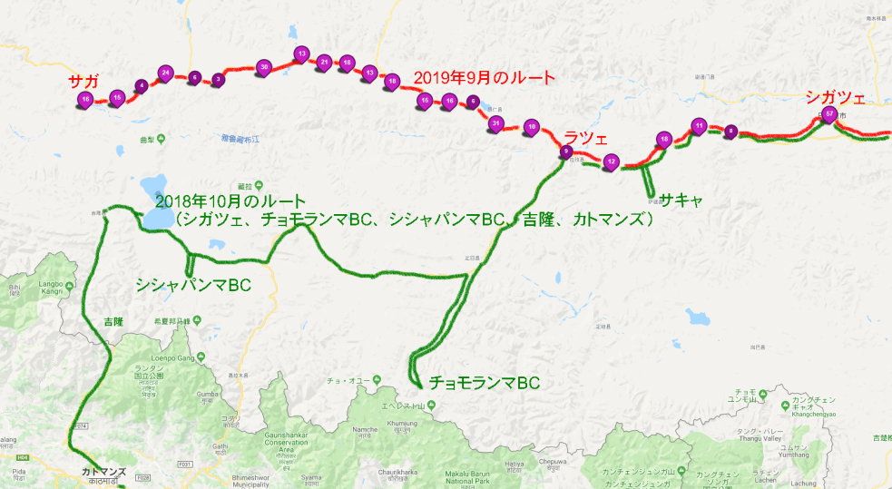 拉薩からずっと昨年10月と同じルートが続いていましたが、ラツェ(拉孜)からは道が分かれて、いよいよ新しい世界を体験することになりました。シガツェ周辺にあった麦畑や菜の花畑は姿を消し、標高4700~4800mの峠や高山植物、珍しい地層などが目につきました。【ルートマップ再掲】【標高4700m以上の峠をいくつも越える】【珍しい地層】【岩に張り付く青紫色の花(種名未確認)】