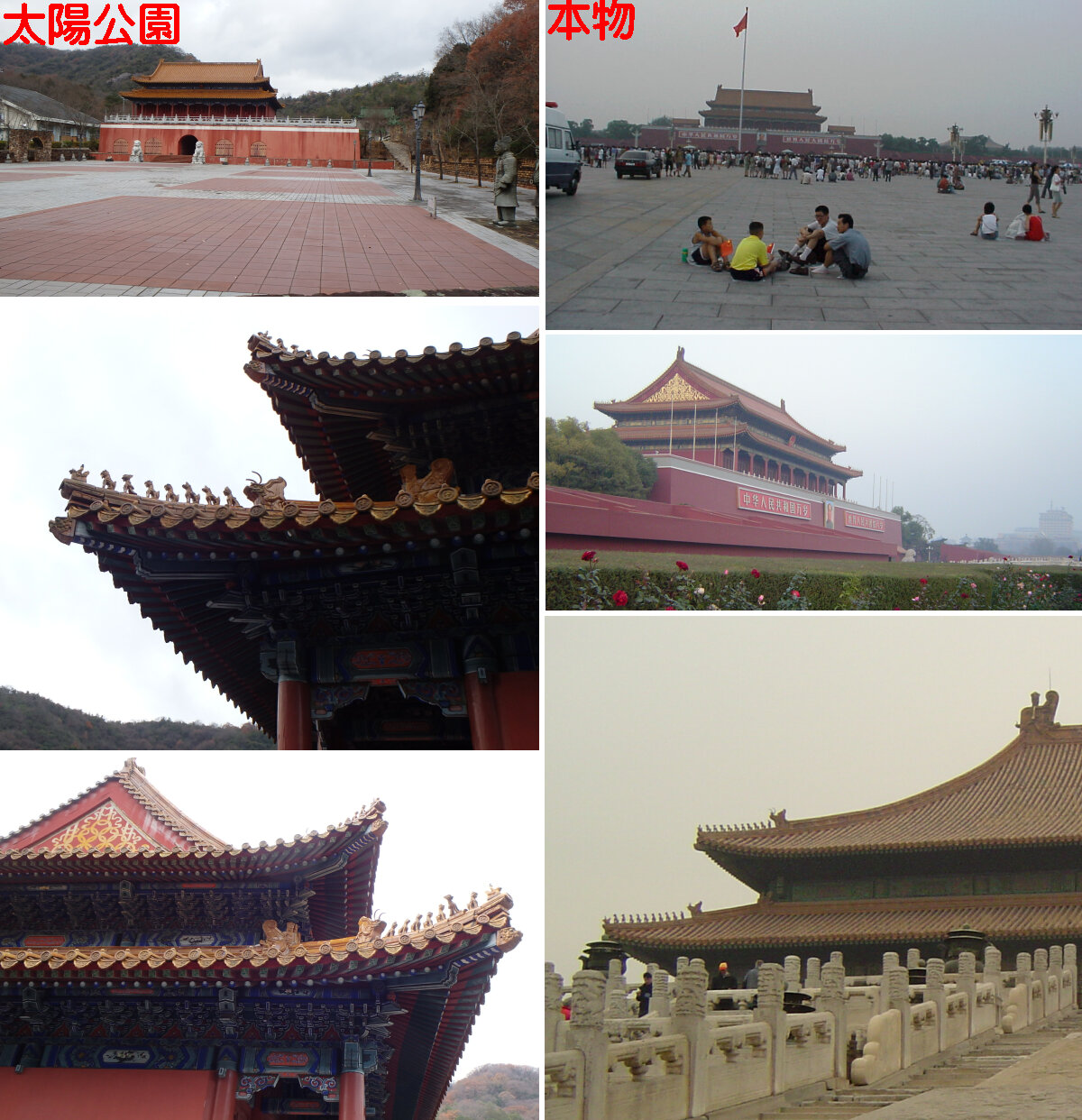太陽公園には、昨日掲載の万里の長城、兵馬俑のほか、凱旋門、韓国鐘楼、モアイ像など、世界各地の文化遺産が再現されていましたが、私自身が実際に訪れたことのある名所は、天安門とピラミッドの2箇所だけでした。↓に、本物との比較写真を載せてみましたが、天安門については中国で施工されたというだけあって細部にわたるまでよくできていました。特に、屋根の上にある「仙人騎鳳」や「走獣」【ネットで調べたところ、仙人騎鳳に続いて、麒麟、鳳凰、獅子、海馬、天馬、押魚、サン猊、カイチ、斗牛(とぎゅう)、行什】がしっかりと配置されていました。いっぽう、一番ウソっぽく見えたのはエジプトのピラミッドでした。こればっかりは、どう再現しようとしても、スケールの大きさで負けてしまいますね。なお原サイズの写真は、以下をクリックしてご覧ください。天安門ピラミッド