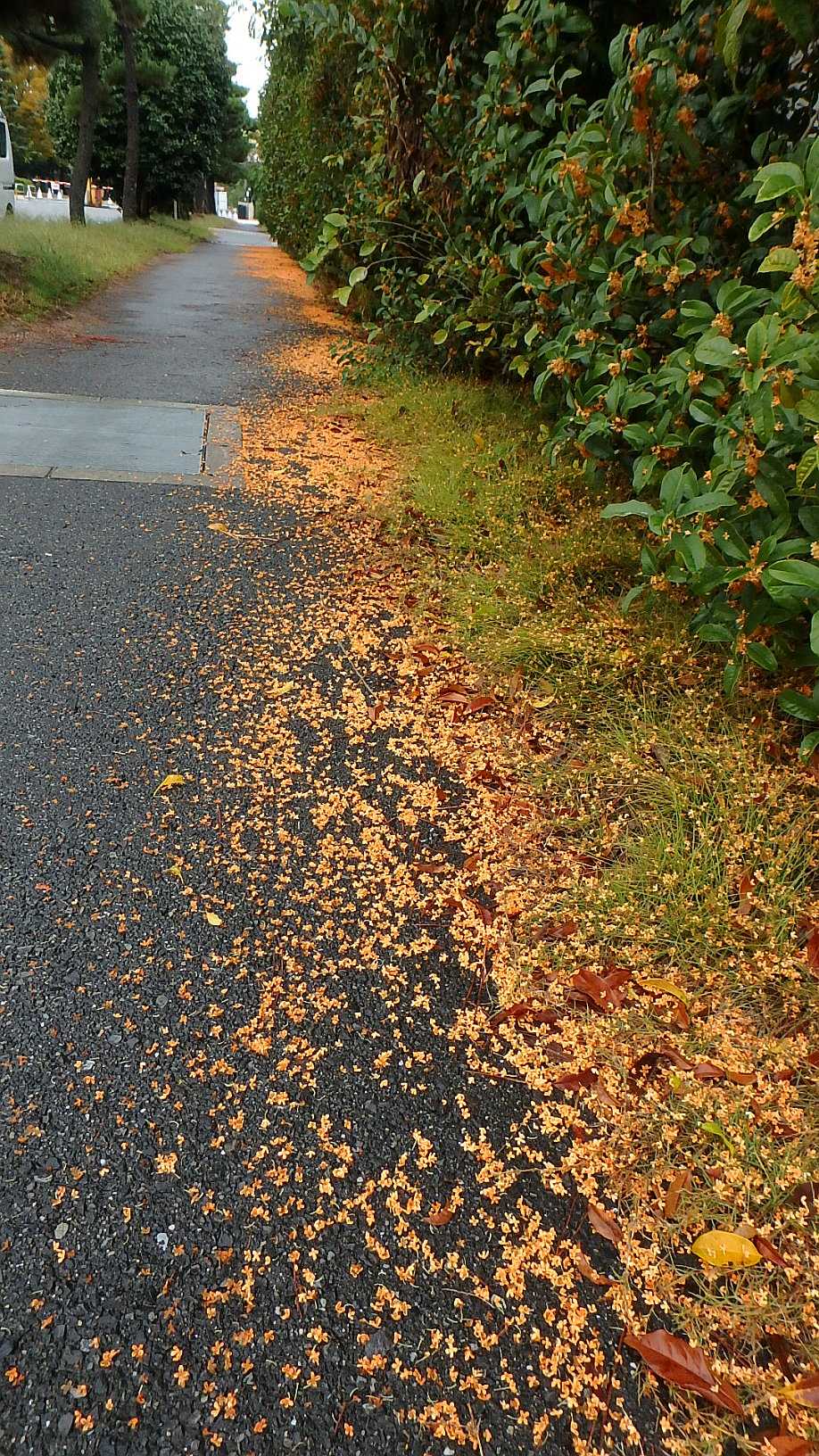 10月23日の岡山は、前日からのまとまった雨が朝までに止み、その後は青空となりました。今回の雨は、24時間積算で62.0ミリ、72時間積算で70.0ミリで、10月の1ヶ月分の平年値81.1ミリの86%が1日で降ったことになります。岡大構内では、この雨で、キンモクセイの花びらが大量に落花し、各所で黄金色の絨毯を作っていました。金木犀による花びらの絨毯は毎年、この時期に見られますが、これだけ鮮やかに積もったのは、岡山での30年近くの生活の中でも初めてではないかと思います。このほか、モミジバフウ、ハナミズキ、ケヤキの紅葉・黄葉も進んでいます。【金木犀の花びらの絨毯】【時計台前のモミジバフウ(アメリカフウ)】【岡大・東西通りのハナミズキの紅葉(左)とケヤキの黄葉(右)】