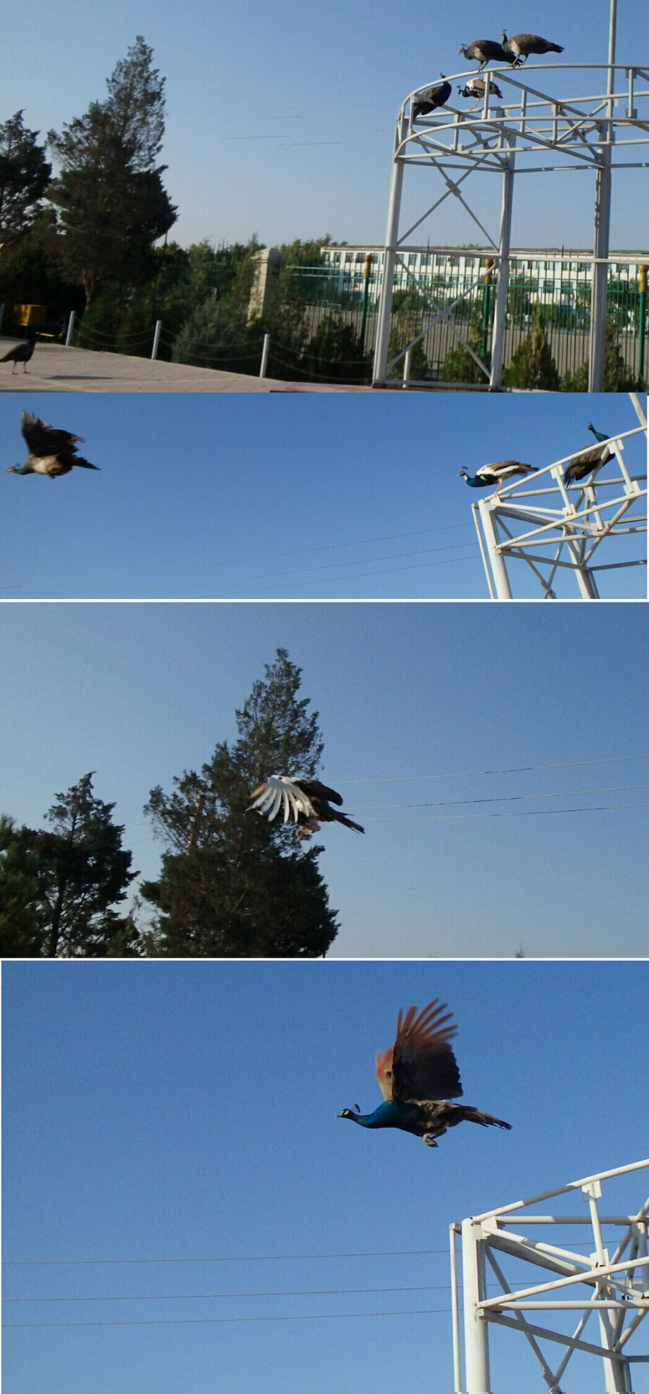 ヤンギ・カラに向かう前日に宿泊したバルカナバートのホテルは一風変わっていて、玄関ホール内ではインコのつがいが自由に飛び回り、ホテルの周りでは、クジャク、七面鳥、ニワトリなどが放し飼いになっていました。砂漠地帯でホテルの周り以外は木々が少ないため、クジャクたちは檻も柵も無くても、逃げ出さないようでした。出発前にホテルの周りを散歩していたところ、ちょうど、高い止まり木からクジャクが滑空しているとことを目撃しました。人生60年余りにして、生まれて初めて、クジャクが飛んでいるのを眺めることができてまことにラッキーでした。写真は滑空場面だけですが、元の高い止まり木に戻るためには、引力に逆らって地上から舞い上がる必要があるはず。しかし、残念ながら、低いところから高いところに飛行する様子は目撃できませんでした。※原サイズの写真は、こちらをクリックしてご覧ください。