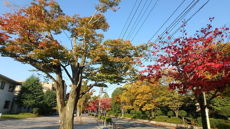 昨日の日記に「雨の日ならではの紅葉」の写真を掲載しましたが、本日は青空が広がり「晴れの日ならではの紅葉」を楽しむことができました。晴れの日の紅葉は青空との対比が魅力です。但し、日の当たっていない部分との明暗の差が大きすぎるという欠点もあります。【岡大・東西通りの紅葉】【時計台前のアメリカフウ】【生協食堂2階から眺めるケヤキの紅葉】【夕日が射し込む座主川】