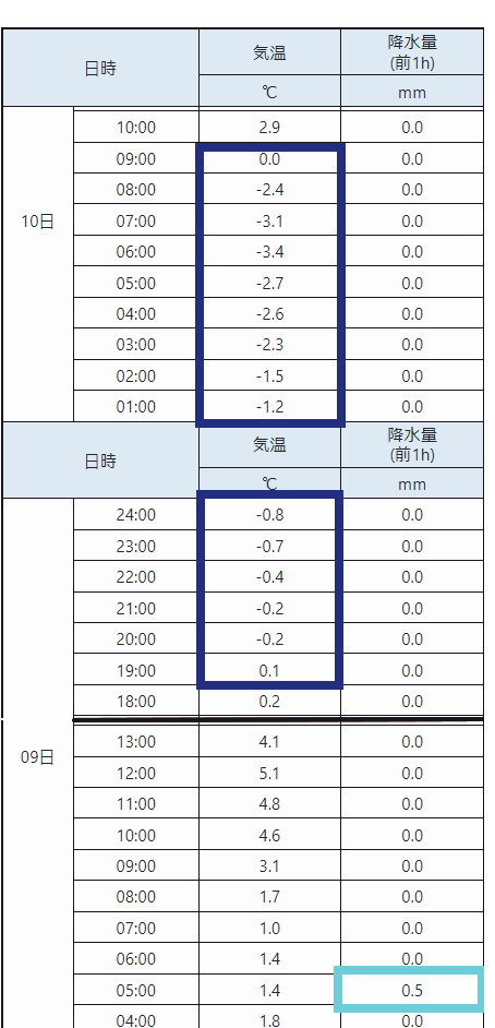 1月10日の岡山は寒波の影響で前日19時台から朝の8時台まで氷点下となり、最低気温はマイナス3.5℃となりました。ということで1月8日に続いて、朝一番にシモバシラの霜華を見物に出かけました。前回は気象条件が揃っていたにもかかわらず数本程度しか出現せず期待外れに終わりましたが、今回はざっと数えて35本、しかもこれまで何度か見た中では最大級に成長したものもありました。【今回の気象条件。前日早朝に0.5ミリの降水があったことも幸い。】【今回のシモバシラ霜華。1つの株のそれぞれの茎からも成長しており、合計約35本に達した】