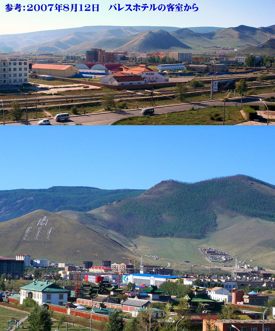 【参考:2007年8月、パレスホテルの客室かが眺める朝のウランバートル。緑の山の中腹にあるチンギス・ハーンのお顔や国章の石組みがよく見えた。】
