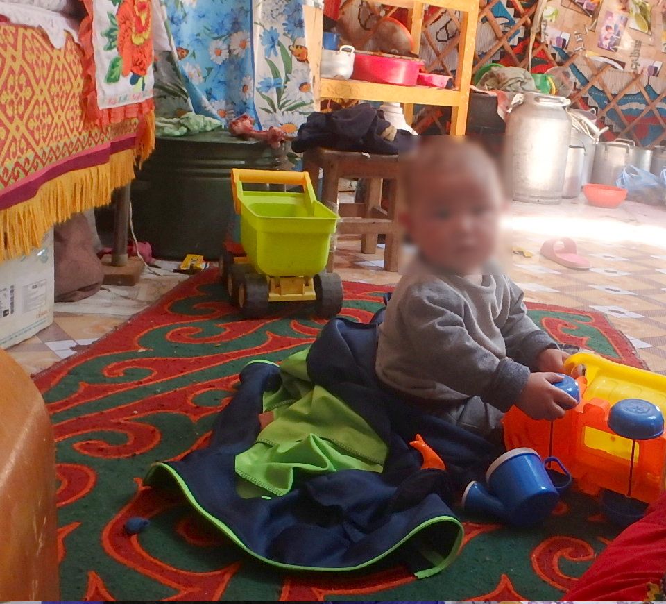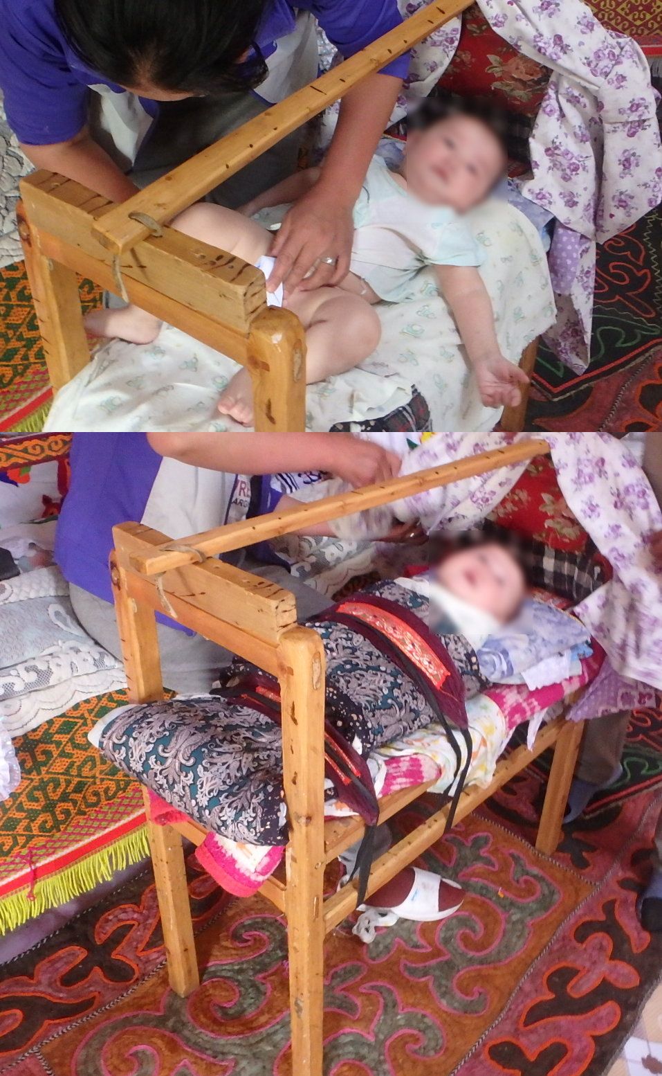 ゲルの中には生後8カ月の赤ちゃんが遊んでいましたが、そのうち昼寝の時間に。ベビーベッドは運搬しやすいように幅が狭くなっていて寝ている間に落っこちないかと心配しましたが、ちゃんと帯で固定して寝かしつけるようになっていました。縛り付けられているようにも見えますが、こういう寝かしつけ方のほうが成長が早いと言っておられました。
