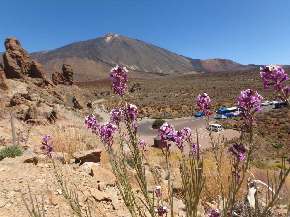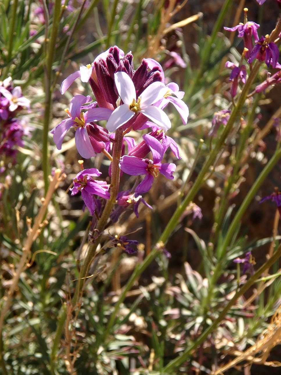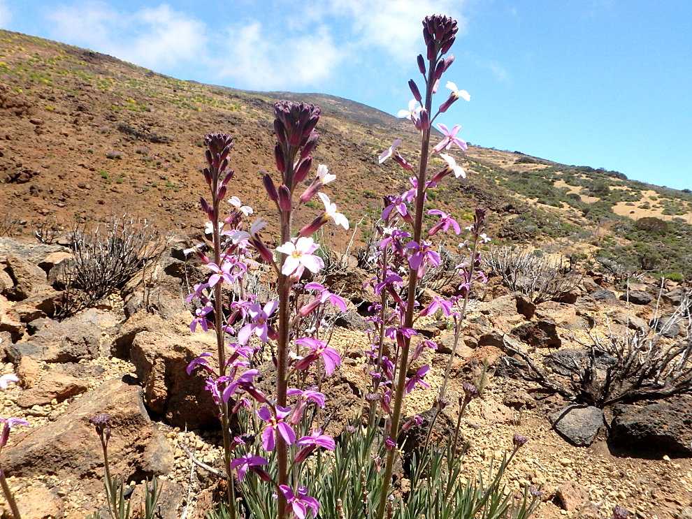 ) という薄紫色の花もたくさん咲いていました。こちらもカナリア諸島固有種で、主にテネリフェ島のテイデ山周辺の乾燥した高山地帯に自生しています。紫や白の小さな花を穂状に咲かせます。乾燥に強く、岩の多い環境に適応しています。アブラナ科。