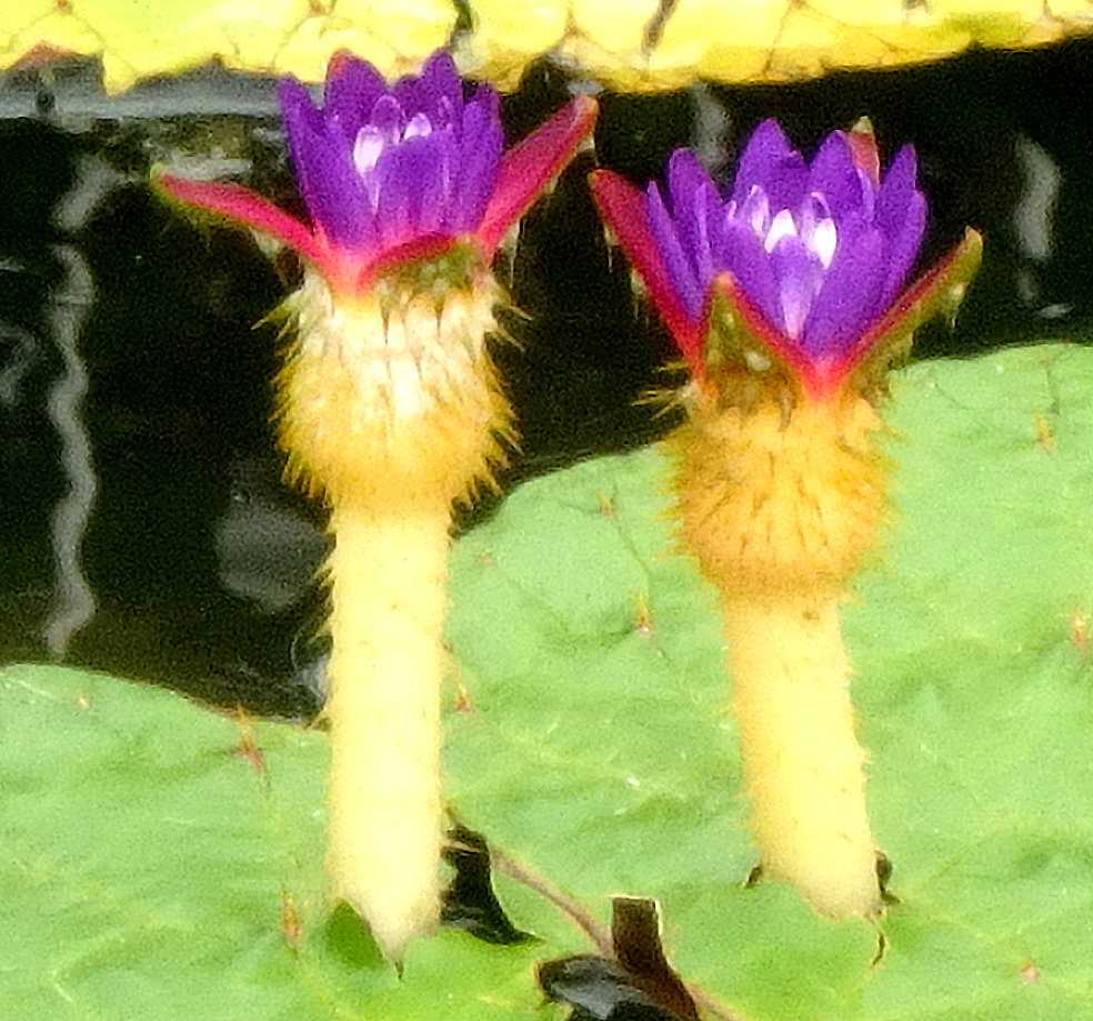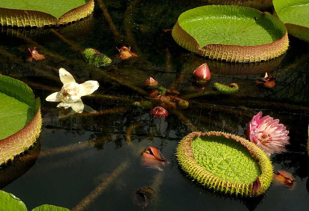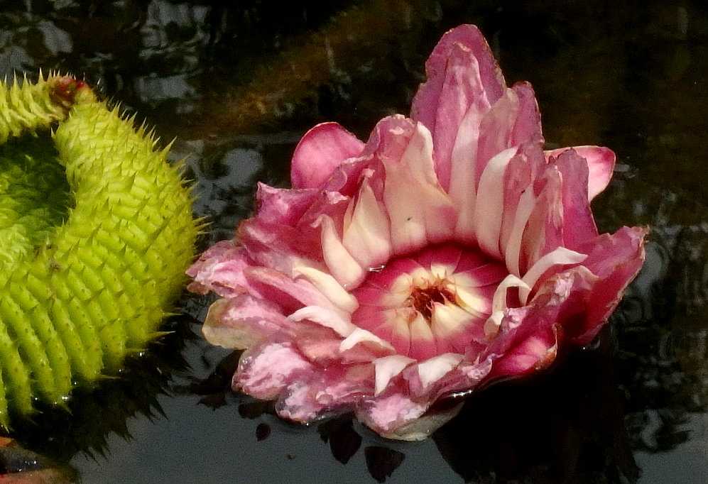 【パラグアイオオオニバスの花。深夜に雨が降ったため、1日目の白花の一部は閉じたまま、2日目のピンクの花はまだ開いたままになっていた】