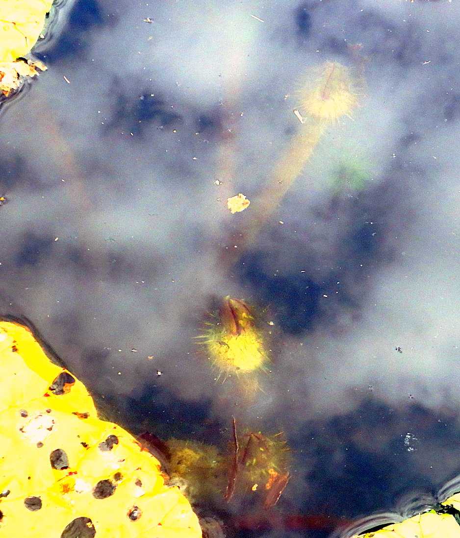 周りのトゲトゲの葉っぱに守られて水鳥などに食べられているのを防いでいる。