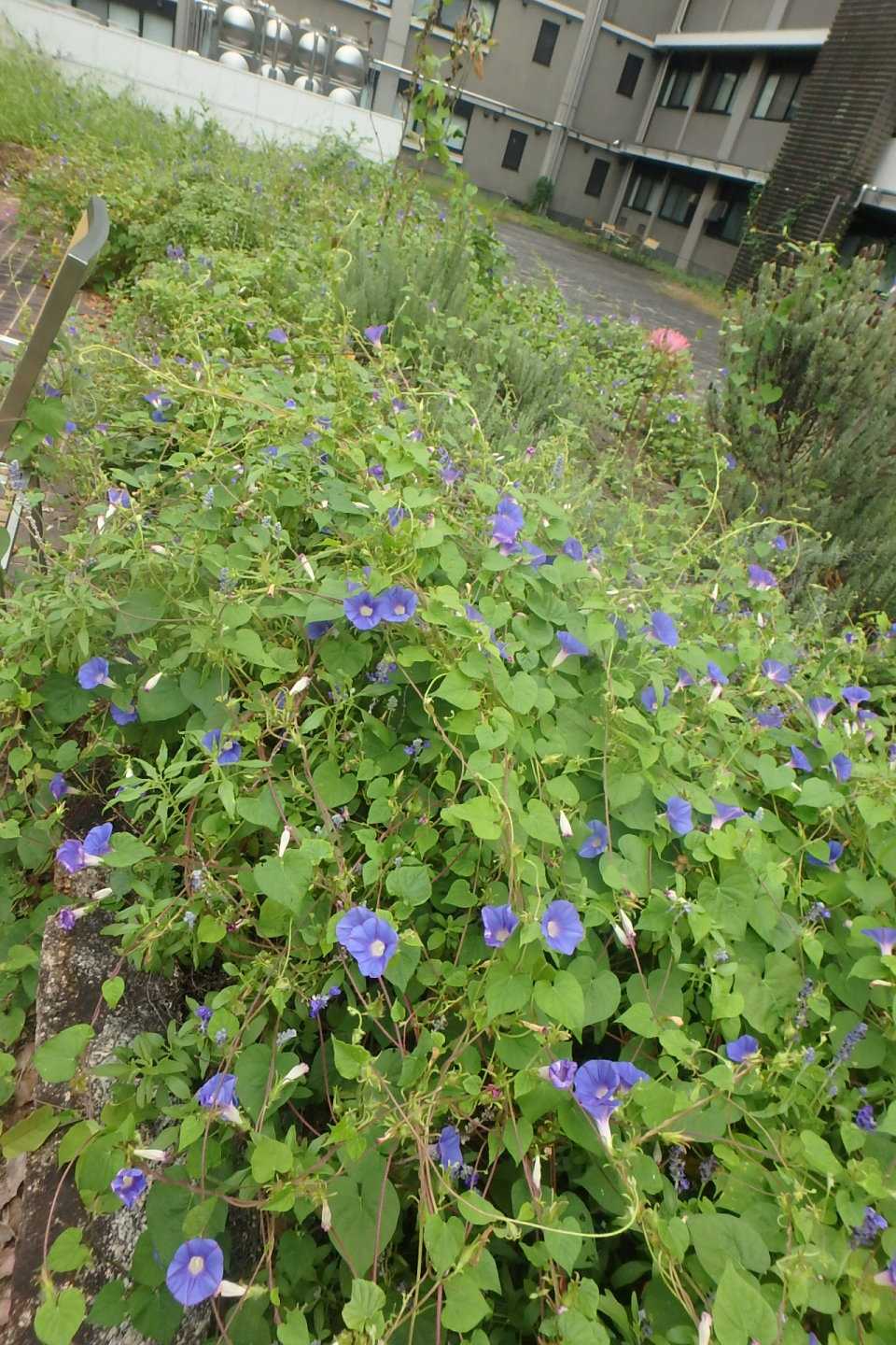 【岡大・文学部中庭花壇を覆い尽くす丸葉系の朝顔】