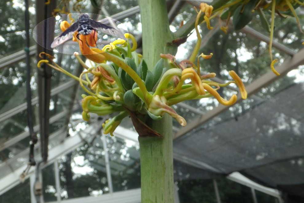 【リュウゼツラン・マルギナータの花に蛾が止まっていた。メンガタスズメの仲間と思われます】