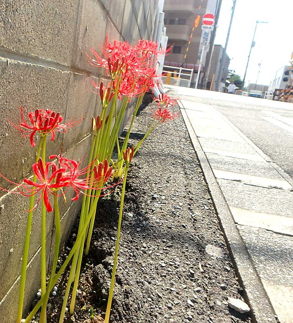 アスファルトを突き抜けて花芽を出す「ど根性彼岸花」は今年も健在。もっともアスファルトとブロック塀の間はそれなりに隙間があり、化成肥料が撒かれた形跡もあることからそれほどど根性ではないかもしれません。