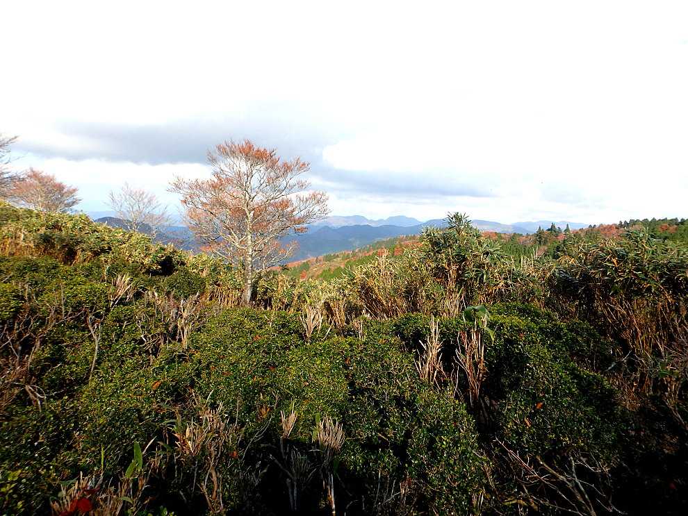 今回は12時07分頃から14時06分頃に通過した区間です。見どころは、六本杉、根曲がり杉、ブナ林、鳥取県側が見える尾根筋などです。尾根筋ではまた、てんぐ巣病にかかったササも目に入りました。