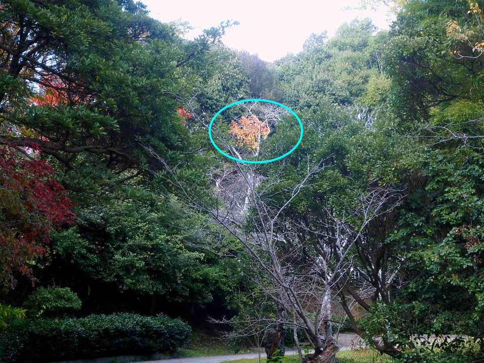 【常緑樹の中から顔を出す人面形紅葉】