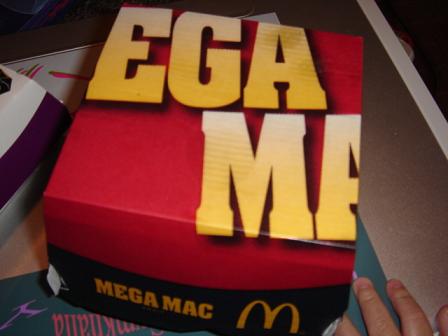 ハンバーガーが無性に食べたいっ!!ってとこで、今話題(?)のメガマックを食べてみました~ビックマックみたいな箱・・・開けてみると、こんな感じパッカちゃんに言わせると、「想像してたよりは、小さい」そうですが・・・お腹が空いてたからか、私が大食いなのか、意外とあっさり完食してしまいましたでも・・・ポテトとかは買わなくて良かった~!メガマックだけで、お腹イッパイ