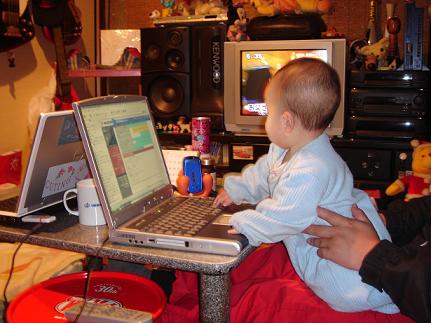 最近、イタズラが酷くなってきた冴空。つかまり立ちをして、伝い歩きして、テーブルの上の物を全部落としてしまいます今日はパッカちゃんの膝によじ登って、パソコンのキーボードをバンバンまだ力加減を知らないので、ものスゴイ勢いで叩いてます楽しくなってきて、TVを見ながらキーボードを叩く冴空・・・・あまりにしつこいので、パッカちゃんにお仕置きされちゃいました首筋をブーブーされる冴空。キャーキャー言って笑ってて、逆効果っぽい