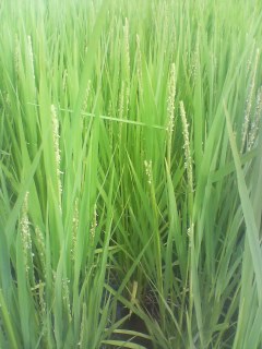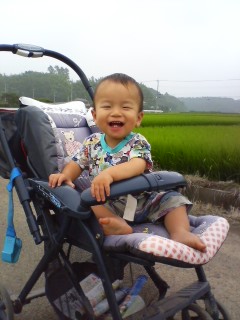 突然ですが!の写真は、稲の写真です。ウチの田んぼじゃないのですが、もう、米が生ってる~!そして・・・なんだか、白いポツポツが付いてますが、これ、何だか分かります??正解は・・・お米の花でした~※花びらはありません。白いポツポツは「おしべ」と「めしべ」なんだそうです。稲にも花が咲くんですねぇ。ちょっとだけ、おりこうさんになりましたさて、今日の冴空さんは・・・チャンス姉ちゃんとベビーカーで、お散歩中飛んでる鳥を見たり、遠くを走ってる車をみたりしながら、楽しそうにしてた冴空。と、その時、田んぼから用水路へ、何かがジャンプたぶんそれは、私の天敵、カエルだと思われるのですが・・・「今すぐ、取って来んか~い!!」と、言いたげな表情の冴空「もう泳いで行っちゃったし、ムリだよ~」と言ってみたら・・・・何やら不満気な冴空。何にでも興味を持つことは、いいことです。だけど、カエルだけは勘弁してください