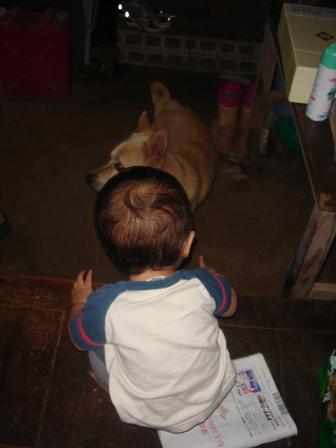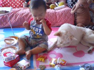 昨日に引き続き、実家で遊んでた冴空とチャンス姉ちゃん。今日も楽しそうに遊ぶ、冴空とチャンス姉ちゃん。今日の遊びは、マク●ナルドごっこだったのですが・・・お客様(チャンス姉ちゃん)がいるにも拘らず、まずは味見の冴空店長ハンバーグのお味は、OKらしい。まだまだ味見ばかりの冴空店長。ナゲットのお味も、大丈夫。ここで、やっとやる気になったのか?お客様の注文の品を作るのに、材料を探してるっぽい冴空店長。「あの~?いつまで待たせるんですか??」待ちくたびれたチャンス姉ちゃん。待ちに待ったチャンス姉ちゃんに出されたのは・・・・・・ハンバーグと・・・・パンだけでしたって言うか・・・ハンバーガーになってないじゃん台風一過で、外はいい天気あっ!店長!!それは食べれません