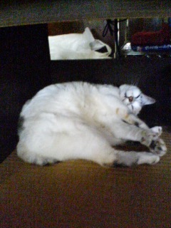 今日は、PCを使って、やらなきゃいけないことがあった私。冴空に邪魔されるし、いつもだったら、みんなが寝静まった夜中にお仕事するのですが・・・今日は天気が良くて、久々に散歩に行けたし、早めにお風呂に入って、思う存分シャワーで遊んで、ゴハンも食べた冴空は、いつもより超ハイテンションキャーキャー言いながら、チャンス姉ちゃんやパッカちゃんと遊んでる今のうちに、仕事を片付けてしまおう。そう思って、仕事開始。いつもだったらPCやってると、「遊んで~!!」と来る冴空ですが、今日は他の遊びに夢中で、こっちに来ない。それはそれで寂しい気もしますが、仕事がはかどる~冴空がキャーキャー言ってるうちに、いつもよりハイペースで進んでいく仕事。だけど何だか、さっきから変な雰囲気・・・何処からか、視線を感じる気が・・・・・・でも、この部屋にいるのは、パッカちゃんと冴空と私と、チャンス姉ちゃんだけなはず・・・冴空は遊びに夢中で、こっちを見てないだろうし・・・・・だけど、なんか変・・・・だけど、これはきっと気のせいに違いない・・・・・・・しかし残念ながら、気のせいなんかじゃありませんでした ヽ(;´Д`ヽ)(ノ;´Д`)ノPCで作業しながら、見上げた先には・・・お仕事中の私を、鏡越しに観察する冴空の姿が何時から見てたのかは謎ですが・・・とりあえず、じゃなくて良かった~