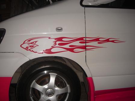 昨日は切るだけ切って、放置プレーだったファイヤーパターンのステッカー。夕方まで他にやることないし、とりあえず貼ってみたお~!なかなかいい感じに出来てますねぇ。今日は時間が有ったので、フェンダーとドアの切れ目も加工してみました~更に、リヤウインドーに、こんなステッカーも貼ってしまったパッカちゃん。とりあえず、完成したNOAH。模様替えしたせいか、イメージがガラっと変わりました~さて!本日の冴空さんは・・・・今日もご機嫌某所で大暴れしたので、お風呂上りにすぐに寝てしまいました