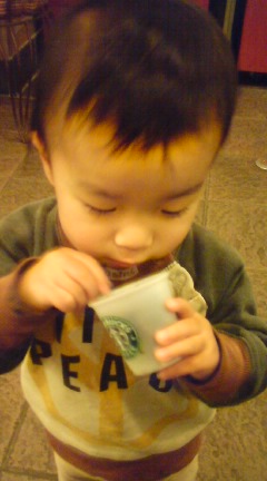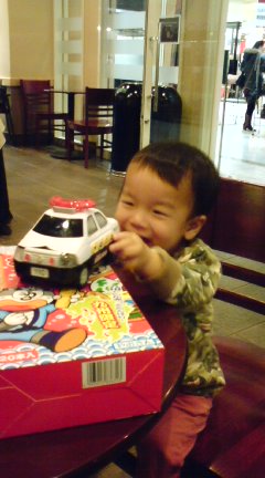 雪マークだった天気予報を鵜呑みにして、長靴まで買ってしまった私。なのに。どうして。起きてみたら、雪どころか、雨すら降ってない訳ですが。( ゚д゚)ポカーン今日も無駄に元気に、スタバに向かった冴空さん。今日もフラペチーノを飲み、みんなに遊んでもらい、そろそろ眠そうな冴空さん。お昼寝しそうだし、そろそろ帰ろう。そう思って、スタバを後にしました。しかし!駐車場に着き、チャイルドシートに座った冴空さん。何だか分からないけど、お目目パッチリ走り出したスイフトの中で、歌なんて歌っちゃってますこれは・・・家に帰っても、寝ないな。自宅では、パッカちゃんがお仕事中お目目パッチリの冴空さん、パッカちゃんの邪魔をするに違いないってことで!もうちょっと時間を稼ぐ為に、イオンに行くことにしました~で、イオンに到着した冴空さん。さて、何をしましょう。そうだ、パッカちゃんが食べたがってた銀だこを買いに行こう。銀だこに行く前にとりあえず、ヴィレッジヴァンガードに行ってみた冴空さん。ピタゴラスイッチのDVDを見てます。見ながら、音楽に合わせて踊ってる冴空さん。なにも、こんな所で踊らなくてもDVDが欲しくなってきた冴空さんですが、今日は買いません 踊ってて先に進まない冴空さんを連行し、銀だこに向かおうとしたのですが。途中にあるゲーセンで、アン○ンマンのゲームを発見「これ、やりたい!」って感じの冴空さん。ピタゴラスイッチのDVDを我慢したし、1回位ならいいか。1回だけの約束で、アン○ンマンのゲームをしてる冴空さん。ゲームが終わり、アン○ンマンのカードをGETした冴空さんですが・・・「もう1度!」あー、やっぱりね。そう来ると思ってたよもう1度ゲームがやりたい冴空さんを再び連行し、今度こそ銀だこへ向かった私と冴空さん。銀だこに到着するまで無駄に時間が掛かってますが・・・無事購入銀だこを、お持ち帰りしてきた冴空さん。自宅に到着後、早速食べ始めました~自らの手でソースをかけて食べてる、冴空さん。周りの部分も食べてるのですが・・・主に食べてるのは、鰹節(謎)鰹節を食べ、ソースを舐めた後は「あーん!」とか言って私に渡してくる冴空さん手に付いたソースまで、残さず舐めてます肝心のたこ焼きは、殆ど私が食べた(食べさせられた)訳ですが。ちょっと!これじゃあ、たこ焼きの意味無いじゃん・・・