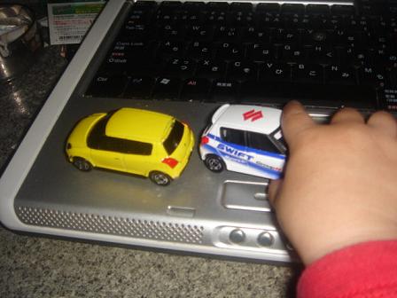 突然ですが。スイフトが、もう1台増えました~(*´艸`)ラリー仕様のスイフトスポーツ1台目は赤いスイフトなので、今度は白いスイフトにしてみた赤いスイフトにも飽きてきちゃったし~ジムカーナにも飽きてきちゃったし~スターレットは捨てちゃって、ラリーに転向しようかなってねそんで、今回納車されたラリー仕様のスイフト。細かいスペックはボディーは、亜鉛合金窓ガラスは、プラスチックシートとライト、タイヤは、ABS樹脂そして、なんと!お値段は驚きの、¥378 ( ゚Д゚)今なら、メカニックも付いてきますってのは、お値段と細かい仕様を除いて全部ウソ本日納車されたのは冴空さんの、ミニカーでした! 目新しいオモチャだからか?ミニカーで、ず~っと遊んでた冴空さん。走らせるのは勿論のこと、みんなに自慢して歩いてます一通り自慢が終わり、部屋に戻ってきた冴空さん。ここで、またしても・・・スイフト撮影会が始まってしまう訳ですが。いつもだったら、シャッターを切ってから被写体にレンズを向ける冴空さん。超流し撮りになってしまったりして、何が何だか分からない写真になってしまうのですが。今日の冴空さん、ちょっと考えました普通にデジカメを手に持ってシャッターボタンを押すと、手が小さい冴空さんが頑張って指を伸ばすので、どうしてもぶれてしまう。なので・・・テーブルにデジカメを立てて置いてる冴空さん。左手でデジカメを固定して、シャッターボタンを押すと・・・今日は、ぶれずに撮れました~だけど、ちょっと近すぎちょっとだけ賢くなった、冴空さん。今日はお風呂上りに、パソコンデスクの下でミスドの箱を発見まだ着替えの途中なのに、食べ始めてしまいましたドーナツを食べながら、なんとか着替え完了。着替えを済ませ、今度は部屋に移動していった冴空さん。今度は、ゲームに夢中なのですが。まぁ、ちゃんと着替えたし、まだ寝る時間でもないし、それはそれでいいのですが。どうでもいいけど・・・鼻をほじりながらゲームをするのだけは、辞めてください