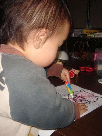 今日も一緒に買い物に行った、冴空さん。晩ゴハンの材料も買ったし、パッカちゃんのつまみも買ったレジで会計を済ませて、買ったものを袋にいれてたら・・・何かを発見した冴空さん台の上に、何かの用紙が置いてあります。しかし、あと少しの所で冴空さんの手は届かず。「おい!ちょっと!こっちに来て、コレ取れよ~!」と言いたげな冴空さん買ったものは袋に入れ終わったし行ってみると・・・台の上に置いてあったのは節分の鬼の塗り絵でした「ご自由におとりください」になっていた、塗り絵。1枚取って冴空に渡してみた。何だか嬉しそうな、冴空さん。塗り絵なんてやったことないけど、お持ち帰り決定です塗り絵をお持ち帰りした冴空さん。やったことがないだけに、塗り絵なんて何のことだか分からないに違いない。なので、冴空さん愛用のエルモのお絵かきセットを出してきた私。お手本に、黄色い色鉛筆を使って鬼のパンツを塗ってみたのですが・・・色鉛筆じゃ、どうもしっくり来ない様子の冴空さん赤いペンを手に取り、塗りだした無駄に真剣な冴空さん。塗り絵に捧げる情熱は、ハンパなものではないようです途中、「キャー!」とか「ワー!」とか、騒ぎ出した冴空さん数分後、完成した作品は・・・・私のような凡人には到底、理解できない仕上がりでしたインクが付いたのか?微妙に鼻が赤い冴空さん。この塗り絵、「塗り終わったら、サービスカウンターにお持ちください。」となってますが。凡人には分からない仕上がりの赤鬼果たして、貼ってもらえるのだろうか?