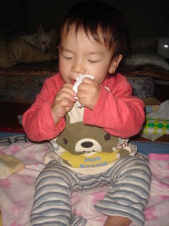 最近、鼻をかむ練習をしている冴空さん。別に、風邪を引いて鼻が詰まってる訳でも無く・・・ある日突然、鼻をかむ練習をしだした冴空さん。まぁ、これはこれで本当に風邪を引いたときに役に立ちそうでいいのですが。次から次へと、新しいティッシュを出してくる冴空さんおまけに、「ママー!」と言いながら、私にもティッシュを渡してきます。今は、原油高等でティッシュが高いなので、もう少し節約して欲しいところですが。何故に冴空さんが、こんなことを始めたかと言いますと・・・原因は、パッカちゃん実は、花粉症なパッカちゃん。朝から、「鼻がー!」って、鼻ばかりかんでます鼻をかみながら、くそー!杉の子コースにやられたー( ゚Д゚)杉と友達だと思ってたのに・・・裏切られたー( ゚Д゚)分かる人にはよく分かる、分からない人には全く分からない文句を言っているパッカちゃん。それもそのはず。パッカちゃんが花粉症になったのは、僅か数年前・・・突然の発症でしたそんなパッカちゃんの姿を見ている、冴空さん。何だか良く解らないけど・・・楽しいことをしているのと勘違いし、真似したくなったようです今日も真似して、鼻をかんでる冴空さん。しかし。風邪を引いてる訳でもないし、花粉症でもない。当然、鼻をかんでも何も出ない。何も出ないことに腹を立ててる、冴空さん。イライラしたからって、こんな顔しなくても今日も、鬼のような形相の冴空さん。そんな顔したって、出るわけないじゃん出ないものを出そうと、無駄に努力してる冴空さん。無駄に努力してたら・・・「何事かー?!」と、みんな集まってきてしまいましたみんなに取り囲まれて、どう反応していいか分からなくなった冴空さん。とりあえず寝っ転がって・・・「ワンワン!」って犬の真似をしてみた冴空さんなのでした