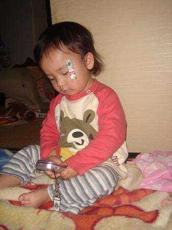 昨日の日記で予告したとおり、今日からドラえもんのキズテープだった冴空さん。アンパンマン同様、すぐに気に入って鏡を見てニヤニヤしていた冴空さんですが。約1週間、キズテープ生活を強いられてきた冴空さん。ちょっとずらして貼ってはみたものの・・・さすがに約1週間も同じようなところに貼り続けていると、かぶれてしまうのは免れないちょっと、ホッペがかぶれてしまった冴空さん。今日は、携帯をイタズラしてます何処かに電話を掛けてしまうとマズイので、キーロックはしてるのですが。イタズラしているうちに、キーロックの解除の仕方を発見してしまった冴空さん得意気な顔でキーロック解除してる冴空さん・・・「何処かに電話が掛かっちゃうじゃん」再び、キーロックする為に携帯を取り戻そうとしたのですが。ものすごーく、嫌な顔をする冴空さんパッカちゃんの携帯に、ワンギリしたり・・・ある人の携帯に、数回に亘って無言電話を掛けた前科があるだけに・・・早いところ取り戻して、ロックしてしまいたいものですしかし。一向に、携帯を手放さない冴空さん。返すどころか、こんな顔で威嚇してきた冴空さんもういいよ・・・・今日のところは、諦めてしまった私なのでした