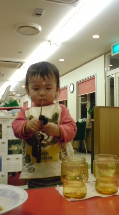 夕方、焼鳥を食べに行った冴空さん近くのテーブルに同じくらいの子供がいたせいか、はしゃぎ気味の冴空さん。はしゃいで遊んでるのはいいのですが。今日も例のごとく、お座敷ですこの間みたいに、はしゃぎすぎて転落事故は・・・・マジ、勘弁(注:転落事故が起きたのは、ここのお店じゃありません!)さて、今日もこんな調子の冴空さんですが。この間の事故の教訓を生かして、こんな調子ながら慎重に行動してますお座敷の縁では、ゆっくり行動。もう、座布団を持ってバックしてみたりしません。この調子なら、今日は安心してゴハンが食べれます安心しきって、ゴハンを食べていたのですが。テーブルの上で立て掛けてあったメニューを、突然手にした冴空さん仁王立ちでメニューをパラパラめくり・・・いったい、何をするつもりなのでしょうクリアファイルみたいなメニューだったのですが。あるページのポケットをめくり・・・・顔を突っ込んで、こっちを見てます・・・・コワイよーしばらく、クリアファイル越しに私を観察していた冴空さん。この遊びにも飽きたのか・・・掘りごたつの中に、消えていきました掘りごたつから顔を出し、「何かくれー!」って感じの冴空さん。そんな冴空さんに、焼鳥を食べさせる私なのですが。掘りごたつの中に、何か得体の知れないペットを飼ってるみたいです勢い良く立ち上がったら、頭を打ちそうだし。「そろそろ、出てきてよー!」と言ったところ、出てきた冴空さん。頭をぶつけることなく、出て来てくれたのはいいのですが。カルピスで酔っ払ってしまったのか?再び手にしたメニューを頭に載せて、何だか遠い目をしてる冴空さんこれじゃあ、訳の解らないことをしてる酔っ払いじゃないか頭にメニューを載せて、いったい何を想ってるのでしょう(謎)そんな謎の冴空さんは、焼鳥にチャーハン、〆にアイスを食べて満腹のはずでしたが。帰宅後、外食しても飲んでばっかりでゴハンを食べてこないパッカちゃん+行かなかった家族の為に作ったきりたんぽ鍋まで食べてる冴空さんあれれ?今日は遊んでる割には、けっこうな量食べてたよね?さっき、「もうお腹いっぱい?」って聞いたら「うん!」って返事してたよね今日も、1人大食い選手権だった冴空さんいっぱい食べるのは、いいのですが。あれだけの量の、ゴハン・・・いったい、冴空さんの小さな体の何処に入ってるのか。まだまだ、冴空さんの体には不思議なことがイッパイです