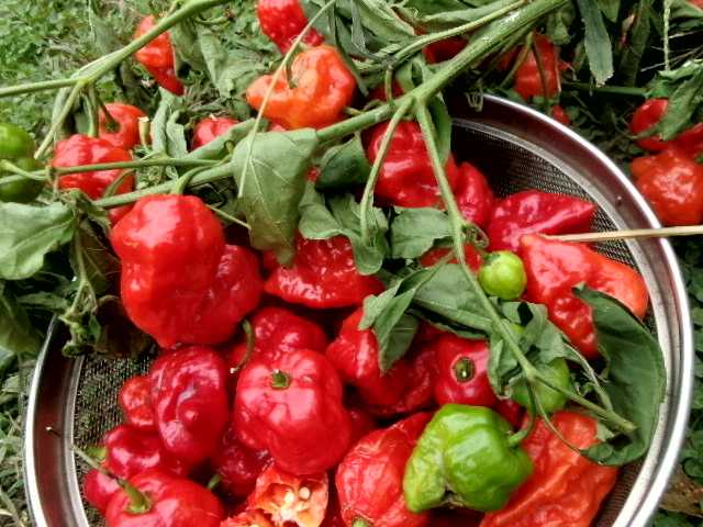 嗚呼、ピーマン採って置いてって言うの忘れてた!配達に出てから気が付いた 家に帰ってから自分で採ろう 家に帰ると玄関の前にピーマンが置いてあった オオ?以心伝心だわ…と ボールに個程入れ料理に取り掛かる トマト料理だから赤いピーマンよりやっぱり緑の通常のピーマンが良い 洗って半分に切り種を取り…玄関にはもう一つ大きな笊にキュウリ!最後のキュウリを収穫したらしい これも一緒に洗ってパンパンパンと大雑把に切って行く ポンと切れ端を口に投げ込む 何かいつもと違うな… と思いつつもパッパと料理を続ける キュウリの後は洗ったピーマンをザクザク切り… 横に作業を終えてを洗う家族「ん?ん?ん?それもしかして外に置いといた奴?」「そうだよ!」「ええええ~~!?」「何?」「大丈夫?」「何が?」「それブートジョロキア!」「何それ?」「ハバネロの10倍の辛さの唐辛子!死ぬよ!」「エエエエ~~!?」そう言えばさっき口に入れたキュウリがやけに辛かった様な!手が急にヒリヒリし始めた!さっき口に入れた時に多分触れた唇がヒリヒリし始めた!エエエエ~~!まさかのジョロキア!?でも、今、知ったから良かった!食べてからじゃ遅かった!と~ちゃんと2人ニュースになる所だった…それにしても触ったんだろうな…鼻もホッペも顔中ヒリヒリ…!目擦らなかったから良かった… それにしてもピーマンそっくりじゃない?絶対そばに置いておかないでね 死なずに済んだ キノコも沢山出ていますが食べません 生きている事に感謝してこれからも生きていきましょう 変な蝶!まるで悪魔!ハロウィン間近