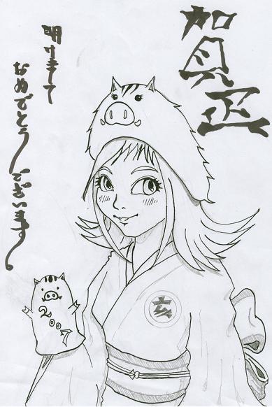 新年イラストです。私は基本的に色塗りが下手っぴなので、白黒です。すんません。。。なぜか「賀正」という文字にかなり気合を入れて書いてみました。